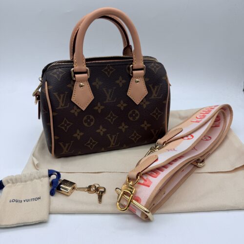 今回お持ち込みいただいたお品物は、モノグラムデザインが特徴的なスピーディ20で、ショルダーストラップ付きの新しいモデルです。コンパクトで使いやすいサイズ感から、現在中古市場でも非常に人気の高いバッグとなっています。